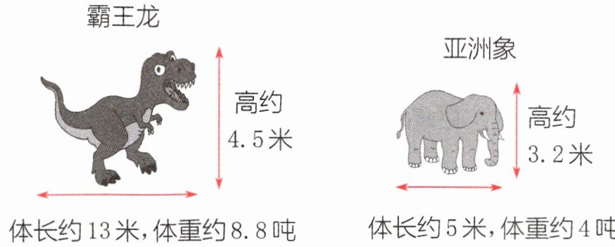 2. 示例:霸王龙体长约 13 米,身高约 4.5 米,体重约 8.8 吨。霸王龙无论是体长还是体重都是亚洲象的两倍以上。