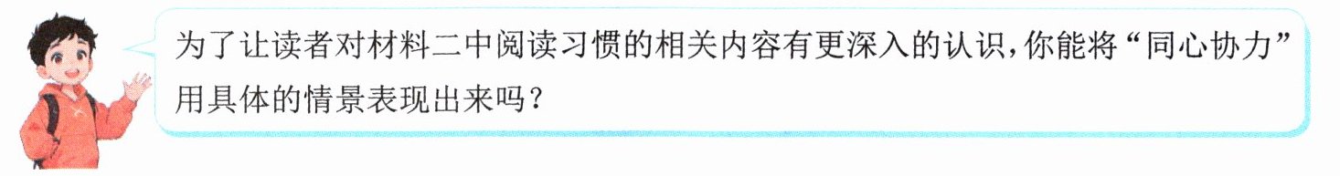 |[材料二] 在改变阅读习惯时,你可能觉得自己速度变慢了,但这是很正常的,就好比初学骑自行车,折腾半小时不如走路走得远,但这并不意味着骑自行车的速度不如走路的速度快。相信只要学校、家庭和自己同心协力,就一定能够养成良好的阅读习惯。| |