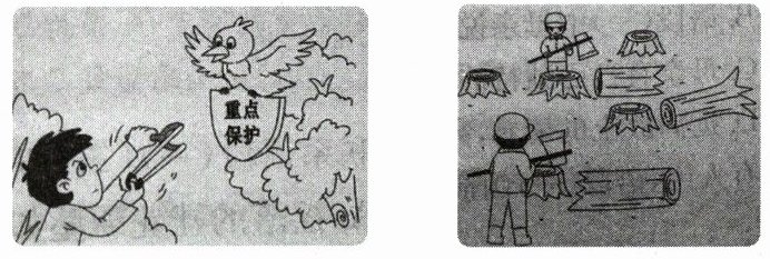 五、同学们在这趟学习之旅中,深刻认识到动植物是人类亲密无间的朋友,为生态平衡作出了巨大贡献。但在现实中,伤害动植物的现象却时有发生。为了守护这些生灵,同学们决定制订动植物保护公约。请你结合图片,把公约补充完整。(6分)