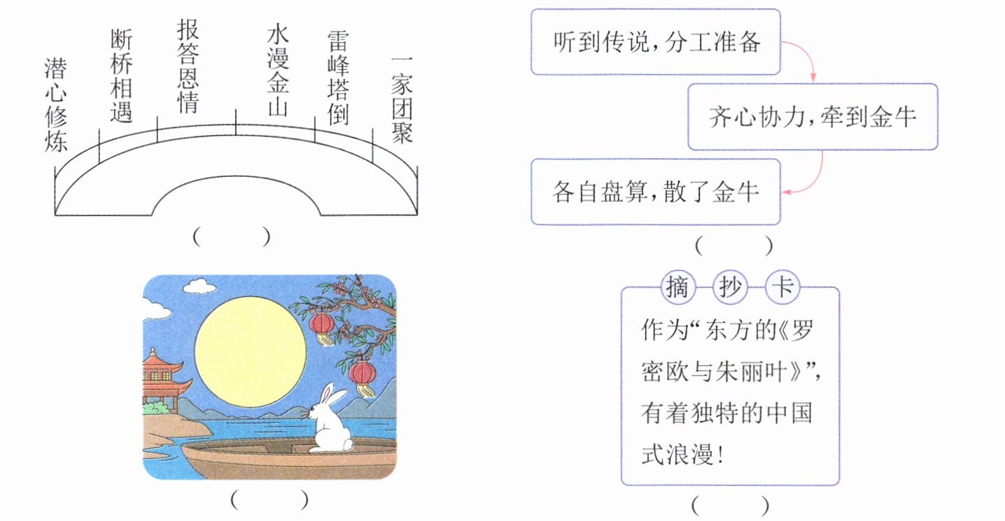 五、小语读了许多民间故事,并用画情节图、做阅读摘抄卡、画插图、摘抄他人评论等方式加以记录。请你猜猜小语读了哪些民间故事吧!(填序号)