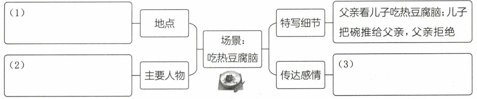 (3)父亲对“我”的爱,“我”对父亲的感激 示例:爸,热豆腐脑很好吃,您也吃一些。 不了,你吃吧,爸刚才吃得很饱,而且我也不爱吃。