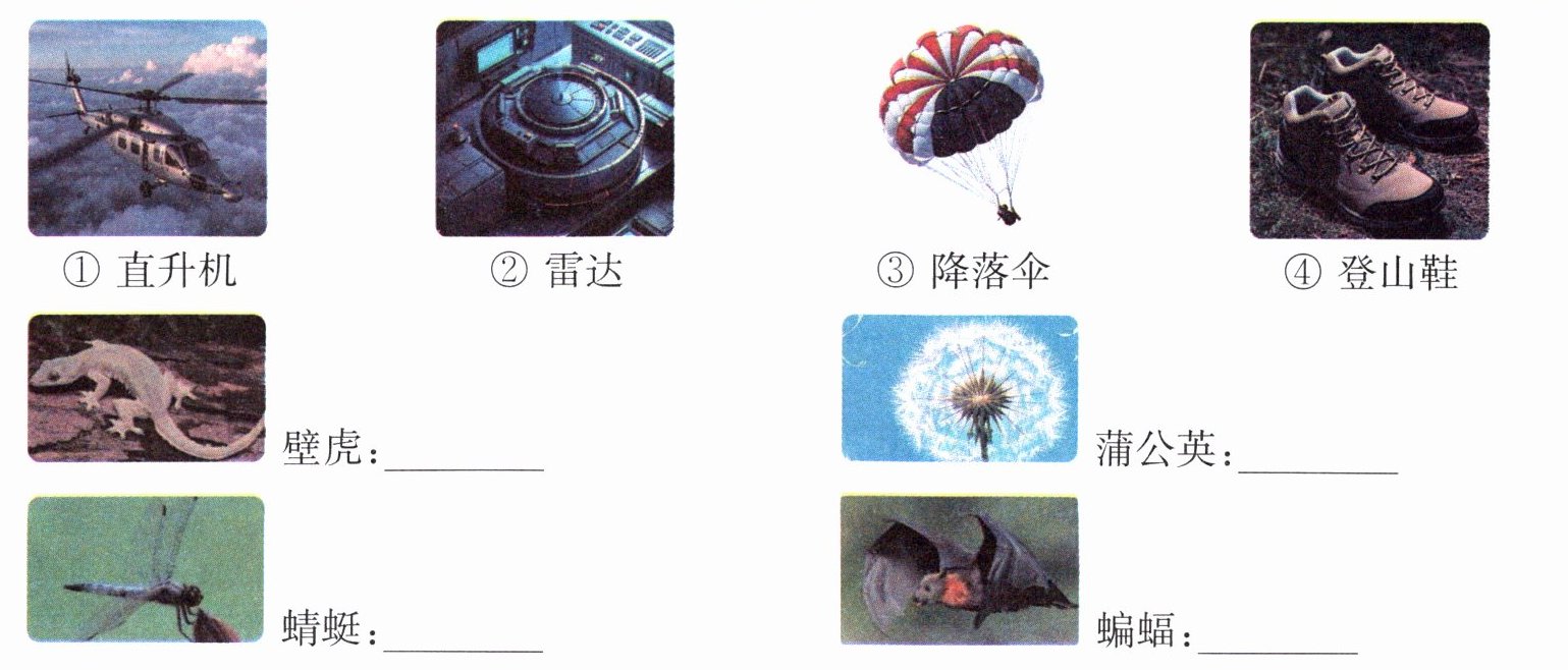 6. ④ ③ ① ② 解析:壁虎足趾腹面的皮肤褶皱形成吸盘,使其能在垂直的墙壁上行动自如,仿生学家由此受到启发,设计出能在陡峭的山地上行走的登山鞋。蒲公英的冠毛有适应风力传播果实的作用,仿生学家根据蒲公英的这种特性,设计出降落伞。蜻蜓的翅膀结构使其在空中能够快速地飞行和悬停,人们由此得到启发设计出直升机。蝙蝠是一种哺乳动物,具有回声定位能力,可以在黑暗中探测和定位障碍物。仿生学家根据蝙蝠的这种特性,发明了雷达。