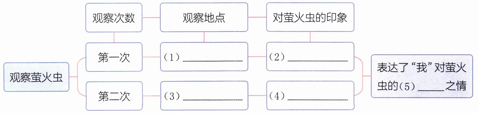 1. (阅读要素)讲解员说得真精彩,他向我们分享了他两次近距离观察萤火虫的经历,请你将相关信息填写在下面的思维导图中。