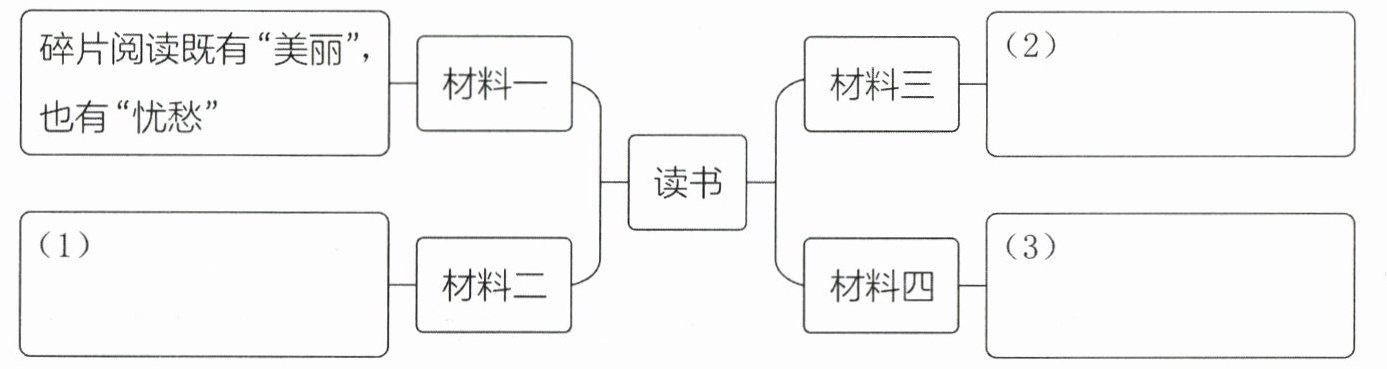 1. (思维导图)以上四则材料都与读书有关,它们分别告诉我们什么呢? 请你概括材料内容,并填写思维导图。(3分)