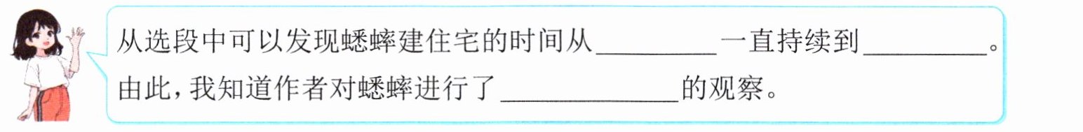 2. (阅读要素)作者是怎样观察蟋蟀盖房子的?请你将下面的对话补充完整。