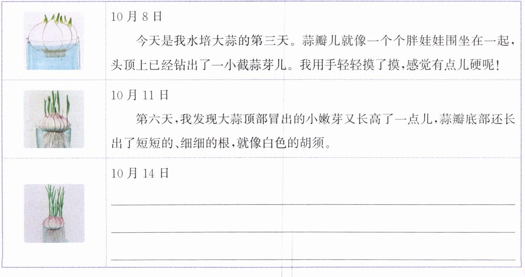 四、[我练表达]阅读下面的观察日记,观察大蒜第九天的变化,把你观察到的和想到的记录下来。