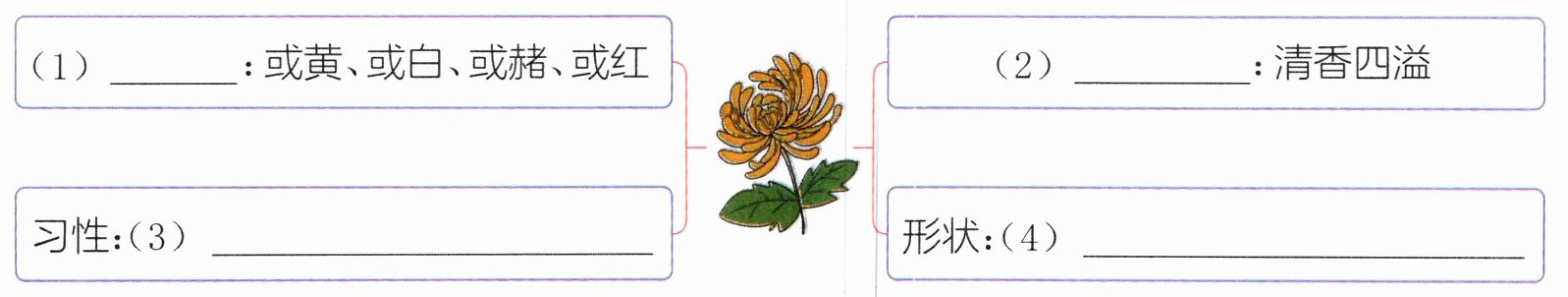 3. (思维导图)作者从哪些方面描写了菊花? 请将下面的思维导图补全并完成练习。