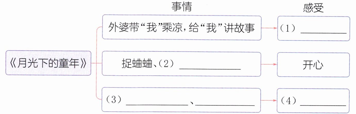 4.(链接教材)读《月光下的童年》,回顾《走月亮》中“月下田园”“月亮牵星”等场景,用小标题的方式概括《月光下的童年》描绘的这几幅生动的画面。