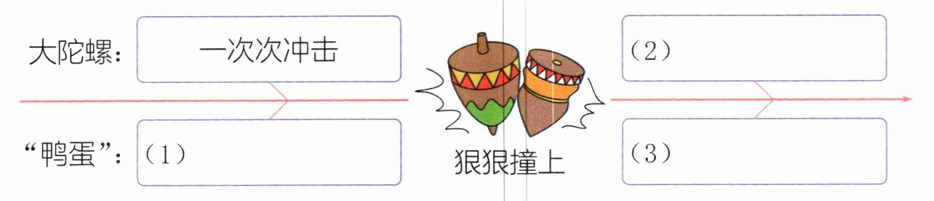 ② 奇怪的是,我的陀螺个头小,却顽强得出奇!明明被撞翻在一边,一扭身又照样旋转起来。它圆头圆脑,好像上下左右都能找到支撑点似的。结果呢,大陀螺在这个始终立于不败之地的对手面前,彻底溃败了。