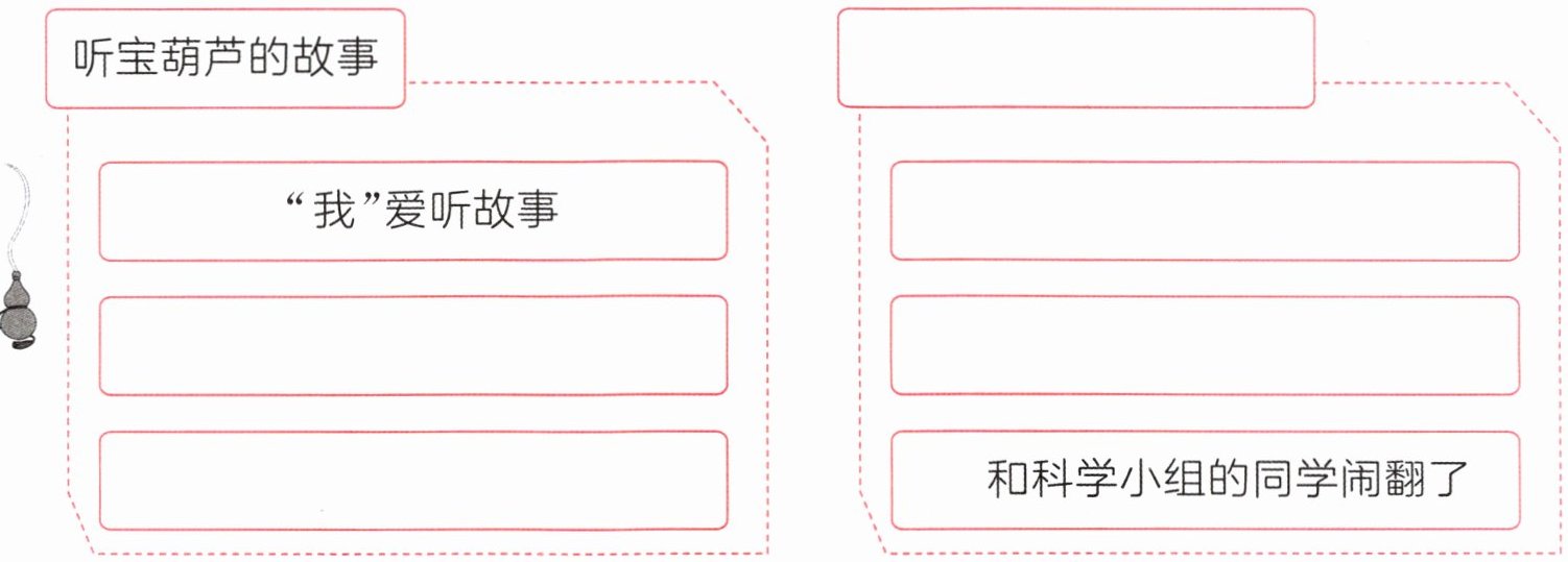 左:缠着奶奶给“我”讲故事 奶奶讲的宝葫芦的故事 右:幻想得到宝葫芦 对着算术题发愣 和同学们比赛种向日葵却谁也比不过