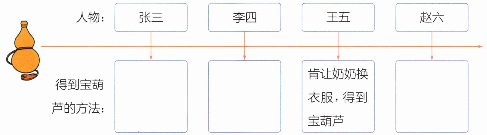 1. (思维导图)奶奶讲的故事中的人物分别是怎样得到宝葫芦的? 请完成下图。