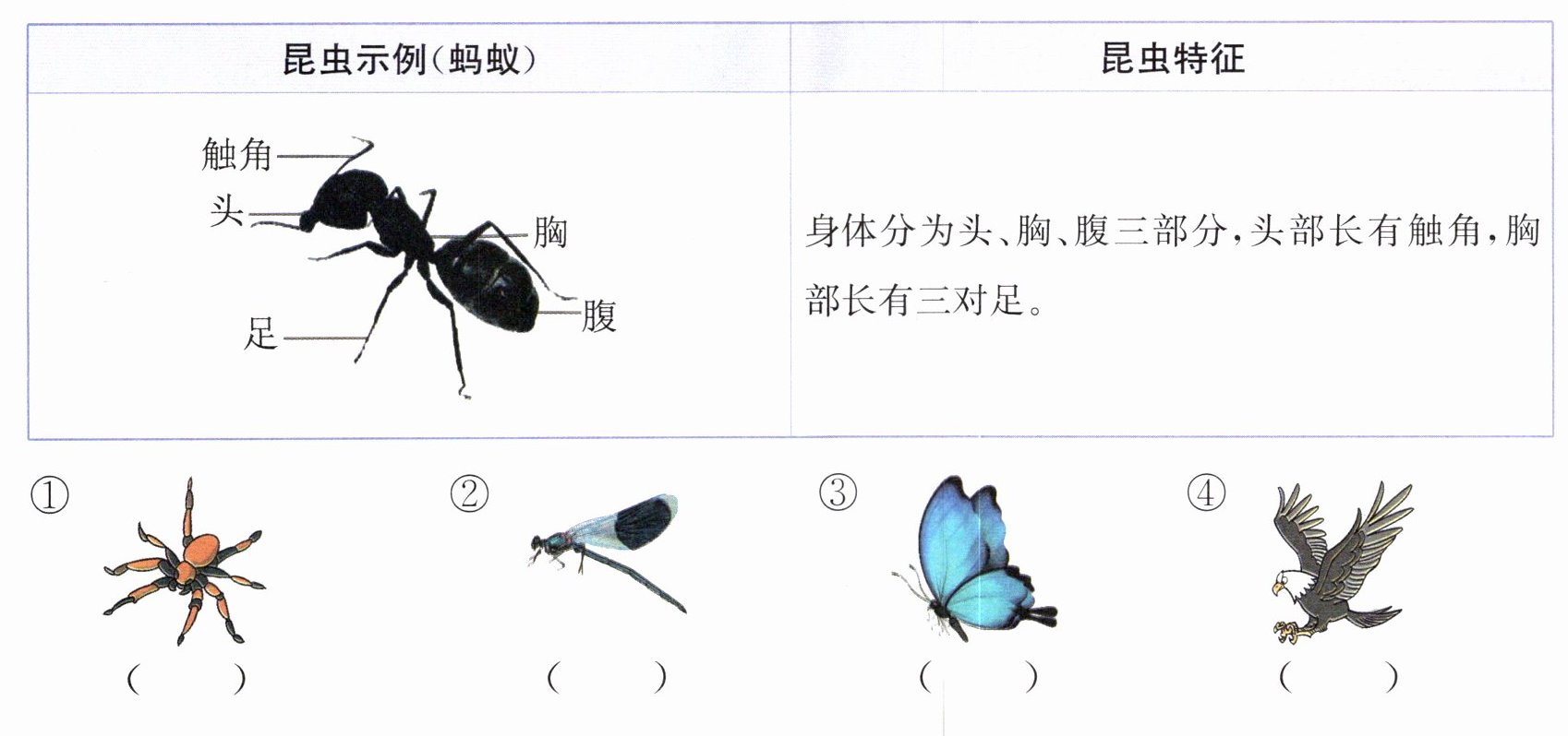 深入了解 四、(跨学科·生物)菲菲查完资料后,得知蚂蚁属于昆虫。请你根据表格内容,判断下面四幅图中属于昆虫的有哪些,在括号内画“√”。