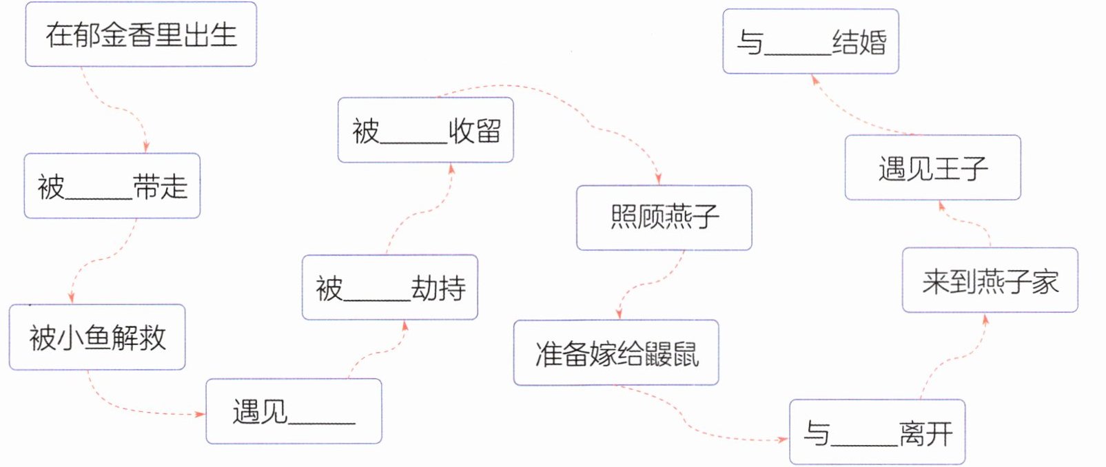 四、拇指姑娘的故事扣人心弦。请按照箭头的提示补全下图。(填序号)