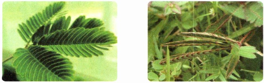 大自然中像蒲公英这样有趣的植物还有很多,如上面这两幅图中的植物,平时,它的叶片是______;当你用手轻轻触碰它时,它的叶片会马上______,就像______,所以人们叫它“______”。