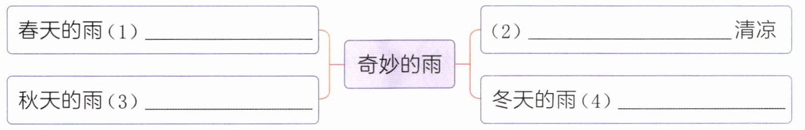 1. (思维导图)作者围绕“奇妙的雨”写了哪几方面的内容? 大地发生了什么变化呢? 请结合短文内容完成下图。