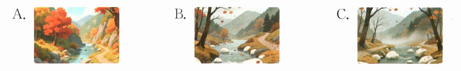 (2)C 解析:这首诗描绘了山中的景色。溪边白石裸露,天气寒冷,红叶稀少。虽然山路上没有下雨,但山中浓重的雾气湿润了衣服。结合这些信息,可选出正确答案。
