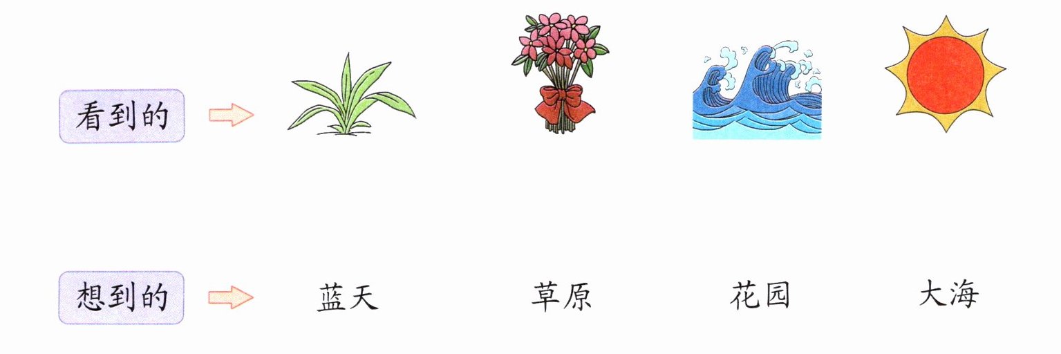 3. 儿歌中的“我”看到小草、鲜花、浪花、阳光后,分别想到了什么? 连一连。
