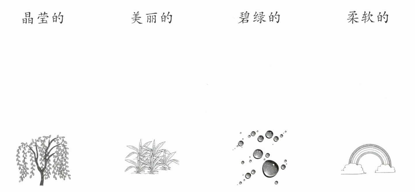 ② 碧绿的柳枝,经过大雨的冲洗,变得更加绿油油了。柔软的小草也醒过来,点着头洒下水滴,感谢阳光的照射。