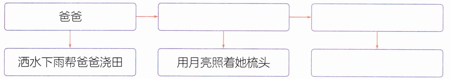 ② 妈妈,您梳头用的那面镜子呢?如果我拿着它,走到桥上,天上不就多了一个月亮吗?我拿着圆圆的月亮照着您梳头,您高兴吗?
