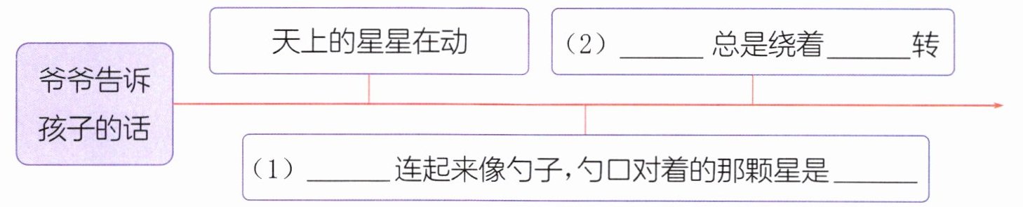 爷爷走过来,说:“孩子,你看得很仔细。天上的星星是在动,可是看起来它们之间的距离好像是不变的。我们的祖先把它们分成一组一组的,还给起了名字。”爷爷停了停,指着北边的天空,说:“你看,那七颗星,连起来像一把勺子,叫北斗七星。勺口对着的那颗星,就是北极星。北斗七星总是绕着北极星转。”爷爷说的话是真的吗?这孩子一夜没睡好,几次起来看星星。他看清楚了,北斗七星果然是绕着北极星转动的。