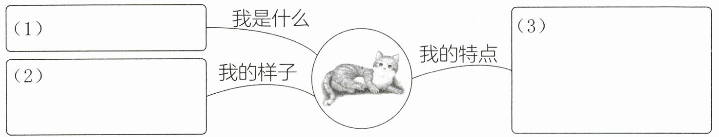 示例:(1)小猫 (2)圆脑袋,长尾巴,全身毛茸茸 (3)爱睡懒觉,好奇心强,追着一根羽毛也能玩很久