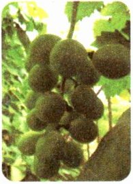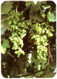 葡萄种在山坡的梯田上。茂密的枝叶向四面展开,就像搭起了一个个绿色的凉棚。葡萄一大串一大串地挂在绿叶底下,有红的、白的、紫的、淡绿的,五光十色,美丽极了。要是这时候你到葡萄沟去,热情好客的维吾尔族老乡,准会摘下最甜的葡萄,让你吃个够。