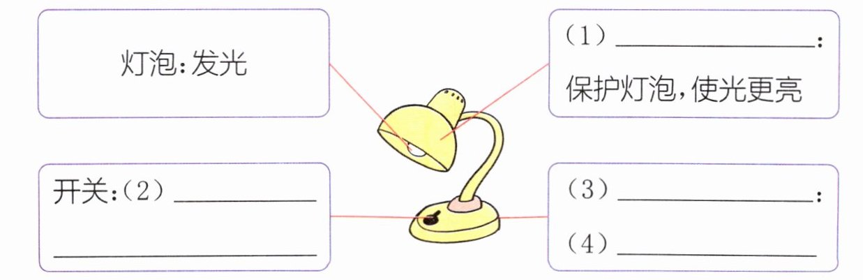 1. ③ 解析:根据“飞蛾最讨厌的是那个黑色的开关,因为他好几次都碰到开关,把脑袋都碰肿了”可知,飞蛾讨厌黑色开关的原因是飞蛾好几次碰到黑色开关,把脑袋都碰肿。 2. (1)灯罩 (2)控制灯泡关闭或者亮起来 (3)灯座 (4)使灯泡站立起来 3. (3)√