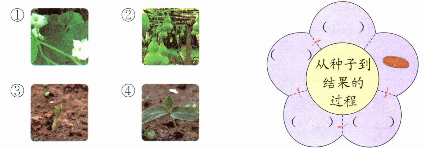 3. ③ ④ ① ② 解析:图①是长叶以后开花了;图②是开花以后结果了;图③是生根以后发芽了;图④是发芽以后开始长叶了。葫芦的生长顺序为发芽、长叶、开花、结果,所以依次填的序号是③④①②。