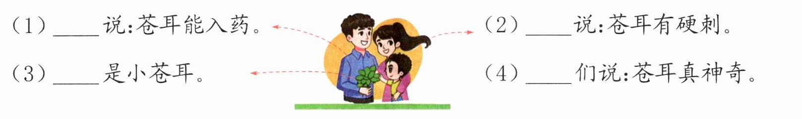 三、小博一家在观察苍耳。看图,在横线上填写不同的“tā”。