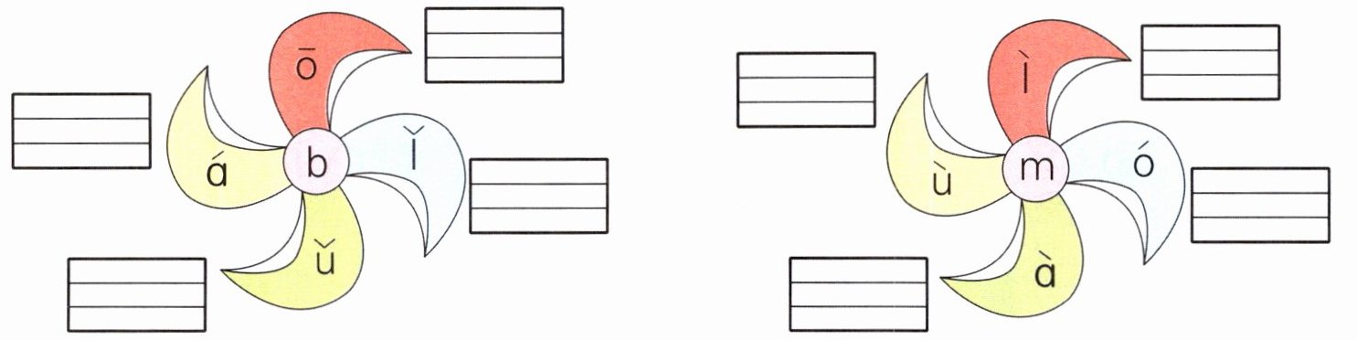 按每个风车“红、蓝、绿、黄”的顺序:bō bǐ bǔ bá mì mó mà mù