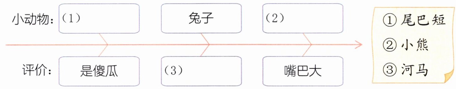 2. (思维导图)小乌鸦评价了哪些小动物?又是怎么评价的呢?