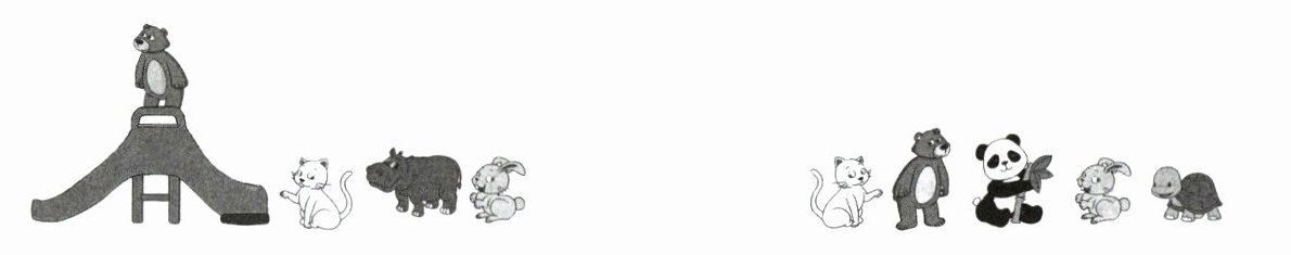 2. 熊猫的( )边是小熊,( )边是兔子。