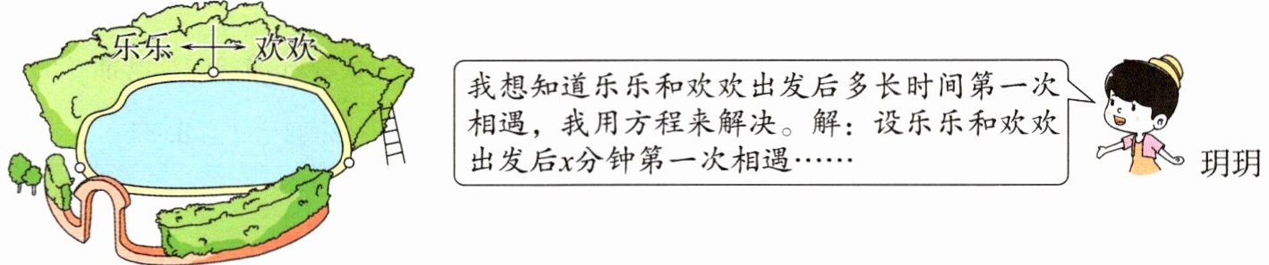 11. (模型意识)乐乐和欢欢绕着小公园跑步锻炼身体,两人同时同地反向跑步,如下图所示。乐乐每分钟跑310米,欢欢每分钟跑290米,第一次相遇时乐乐比欢欢多跑了170米。请你按照玥玥的想法,用方程来解决她提出的问题。