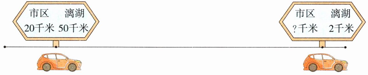(2)连接市区和漓湖的是一条笔直的公路,爸爸驾车从市区出发开往漓湖(匀速行驶),下面是明明先后两次看到的路牌。请根据路牌中的信息算一算,爸爸从市区出发已经行驶了多少千米?