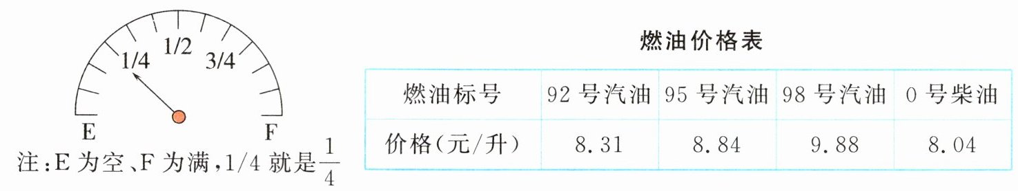 (1)明明家的汽车油箱容量为 50 升。当明明一家到达他们家附近的加油站时,爸爸看到如下图所示的汽车油表,将油箱加满一共花了 331.5 元,明明家的汽车油箱加的燃油是多少号?