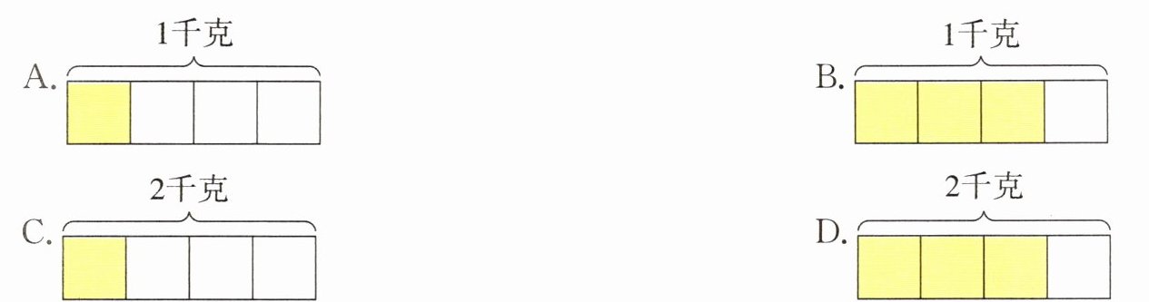 3. (数形结合)下面各图中的涂色部分能表示$\frac{3}{4}$千克的是( )。
