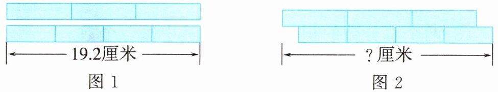 4. (环保意识)在学校举行的“废物利用,变废为宝”实践活动中,明明想用一些旧布条做手工。他和妈妈找了一些旧布条,妈妈让他先剪了两块同样长的长方形布条,再将这两块布条分别等分成3份和4份(如图1所示),然后进行了重新拼摆(如图2所示),拼摆后的图形长多少厘米?