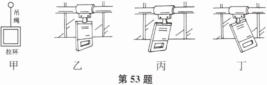 53. 平直公路上有一辆公交车.图甲是车内拉环正面的示意图,图乙、丙、丁是在该车内观察到的同一拉环在不同时刻侧面的情景,车头在拉环左方.以下判断正确的是( )