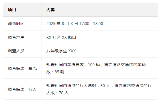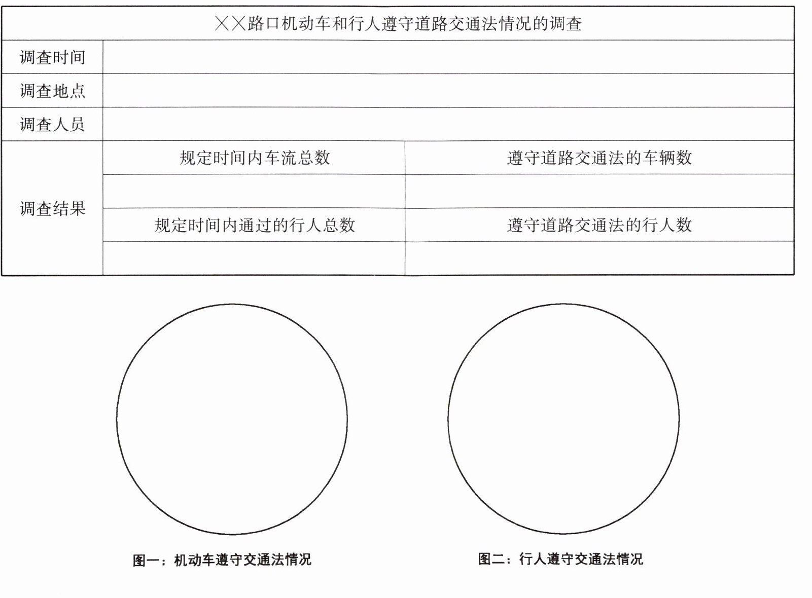 请选择社区附近的十字路口,在一定的时间里(如一个小时),调查机动车和行人遵守道路交通法的情况,并将统计结果制作成扇形图。