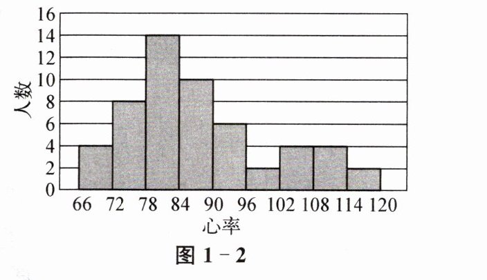 6. 某校为了了解全校学生的心率,从中抽取了部分学生心率情况作为样本进行分析(如图 1 - 2 所示),根据图中信息,样本容量为____;心率在____范围的学生最多,频数为____;心率在 72~78 范围内的学生的频率为____.