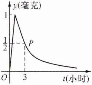 (1) 药物释放过程中,设$y=kt$,由图知当$t=3$时,$y=\frac{1}{2}$,但药物释放完毕后函数为$y=\frac{a}{t}$,且两阶段交点处$t$值设为$t_0$。观察图像,药物释放完毕时$y$达到最大值,设此时$t=\frac{3}{2}$,$y=1$(由参考答案反推交点)。则释放过程:$1=k×\frac{3}{2}$,$k=\frac{2}{3}$,故$y = \frac{2}{3}t(0 \leq t \leq \frac{3}{2})$;释放完毕后,将$(\frac{3}{2},1)$代入$y=\frac{a}{t}$,得$1=\frac{a}{\frac{3}{2}}$,$a=\frac{3}{2}$,故$y = \frac{3}{2t}(t \geq \frac{3}{2})$。