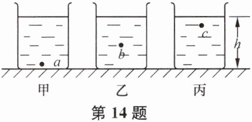 14. 如右图所示,甲、乙、丙三个相同容器中分别盛有密度不同的液体,已知 $a$、$b$、$c$ 三处液体的压强相等。则______容器中的液体密度最大,______容器底部受到的液体压强最小。