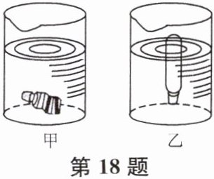 18. 取一只空牙膏袋,一次将它挤瘪,另一次将它撑开,两次都拧紧盖后先后放入同一杯水中,如图所示。两次牙膏袋的质量 $m_{甲}$ 和 $m_{乙}$ 的大小关系是 $m_{甲}$______$m_{乙}$(不计袋内空气质量);两次排开水的体积 $V_{甲}$ 和 $V_{乙}$ 的大小关系是 $V_{甲}$______$V_{乙}$;两次所受的浮力 $F_{甲}$ 和 $F_{乙}$ 的大小关系是 $F_{甲}$______$F_{乙}$;两次杯底受到水的压强 $p_{甲}$ 和 $p_{乙}$ 的大小关系是 $p_{甲}$______$p_{乙}$。