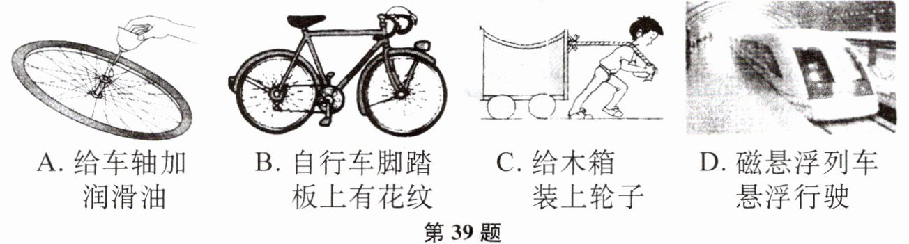 39. 如图所示的四个实例中,目的是增大摩擦的是( )
