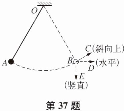 37. 如图所示,在竖直平面内用轻质细线悬挂一个小球,将小球拉至A点,使细线处于拉直状态,由静止开始释放小球,不计摩擦,小球可在A、B两点间来回摆动.当小球摆到B点时,细线恰好断开,则小球将( )