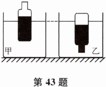 43. 一个薄壁密封饮料瓶内装有一些饮料,分别放在装有甲、乙两种液体的容器中,静止后饮料瓶的状态如图所示.饮料瓶受到的浮力分别为F_浮甲、F_浮乙,甲、乙两种液体的密度分别为ρ_甲、ρ_乙,则( )