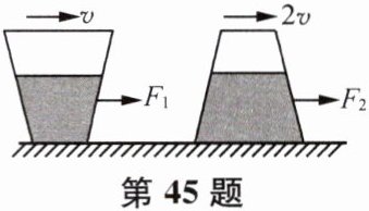45. 两个用同一种材料制成且完全相同的密闭圆台形容器一正一反放置在同一水平桌面上,容器内装有质量和深度均相同的液体,如图所示.若它们分别在水平方向拉力$F_1$和$F_2$的作用下沿桌面做匀速直线运动,速度分别为v和2v,容器底部受到液体的压强分别为$p_1$和$p_2.$下列关系正确的是( )