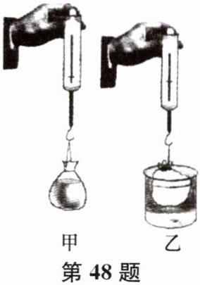 48. 如图甲所示,在一只薄塑料袋中装水过半(未满).用细线扎紧袋口,用弹簧测力计测得其所受重力为9N;再将这个装水的塑料袋浸入烧杯内的水中.如图乙所示,当弹簧测力计示数为6N时,袋内水面与烧杯中的水面相比(不计塑料袋和细线的重)( )