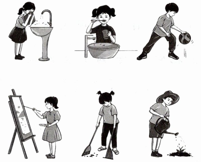 shuā yá pāi qiú huà huà sǎo dì jiāo shuǐ tā