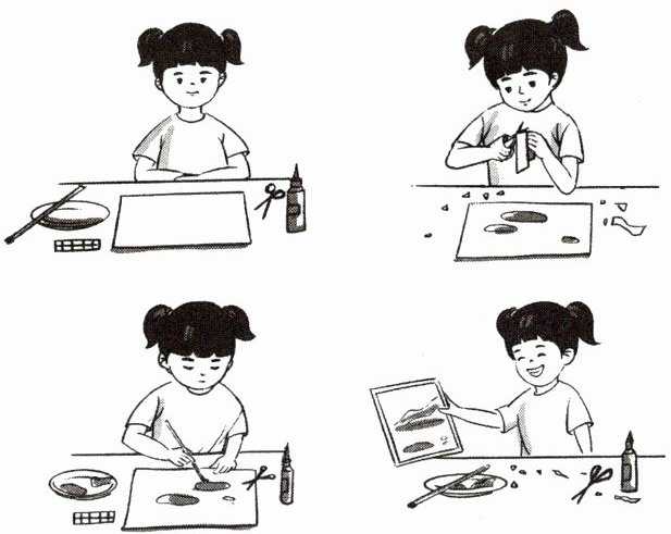 同学们,看图想一想:这是什么时间你在什么地方做手工?回想自己做手工的过程,试着用上“先、再、然后、最后”这些词语把几句话连起来说清楚。